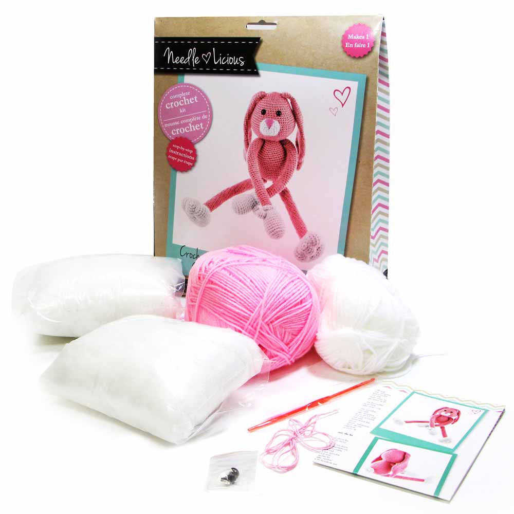 Crochet your own funny bunny! A complete crochet kit including step-by-step instructions. Included: acrylic yarn, felt, safety eyes, fiberfill, 3mm crochet hook, darning needle and instruction sheet. Makes 1.