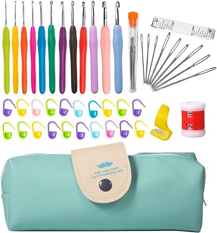 This 45 piece crochet hook set includes 12 Crochet hooks, 9 steel blunt needles, 20 stitch markers, soft tape measure, row counter, ring cutter and Storage Bag ,it’s has everything you need to get crocheting .