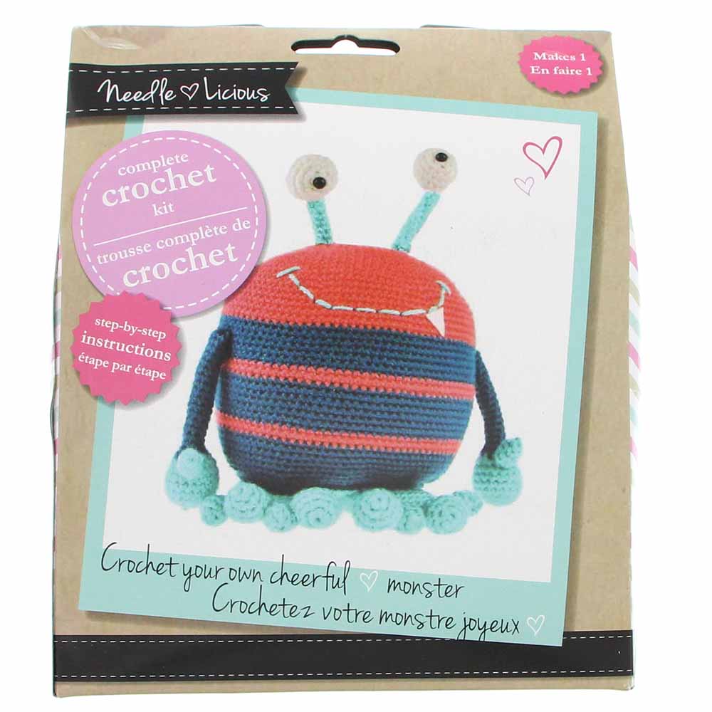 Crochet your own cheerful monster! A complete crochet kit including step-by-step instructions. Included: acrylic yarn, felt, safety eyes, fiberfill, 3mm crochet hook, darning needle and instruction sheet. Makes 1.